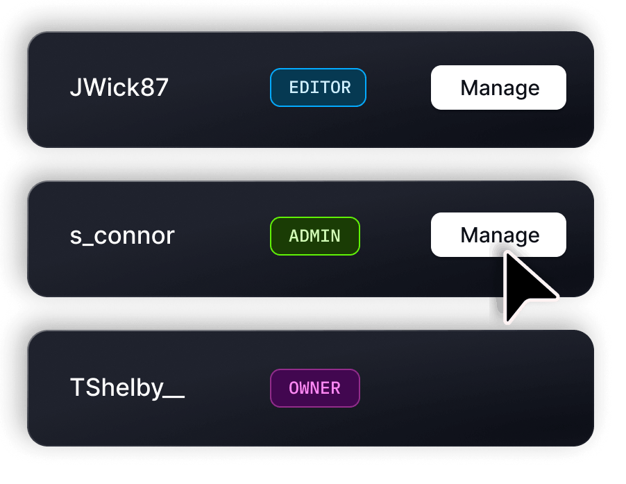 Let all stakeholders to participate in the governance process. Add organization members with granular permissions for Owners, Admins, Editors, and Viewers.